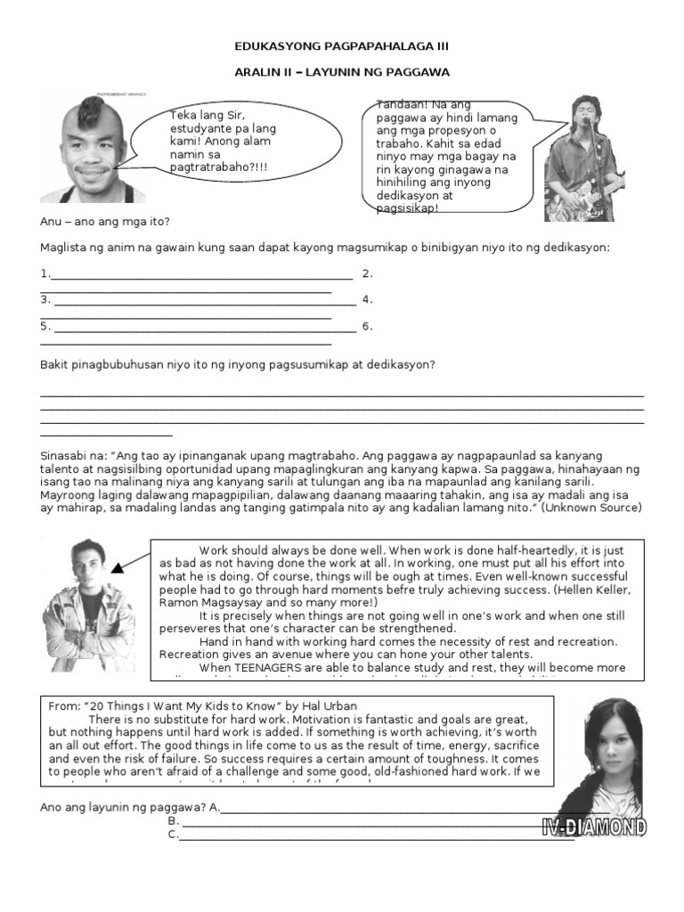 Bakit nagkakaiba-iba ng layunin sa kanilang ginagawa ang mga may buhay na nilikha ng Diyos. Pagbibigay Diin Kahit na ang lahat ng mga panutoy dapat sundin may mga panutong kinakailangang bigyan ng importansya sapagkat kapag silay nakaligtaan ay may malaki itong epekto sa kabuuang resulta. 3 See answers Another question on Edukasyon sa Pagpapakatao.