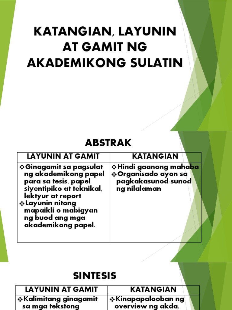 Akademikong Sulatin Layunin at Gamit Katangian Abstrak Ito. Ito ay makakatulong sa pagpapataas ng kaalaman sa ibat ibang sining at larangan. Pamamaraang deskriptibo kung saan ang pangunahing pakay sa pagsulat ay maglarawan ng mga katangian anyo hugis ng mga bagay o pangyayari batay sa mga nakita narinig natunghayan naranasan o nasaksihan.