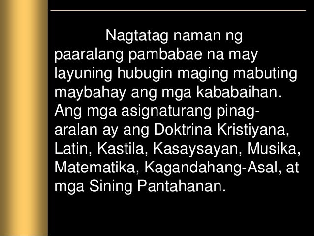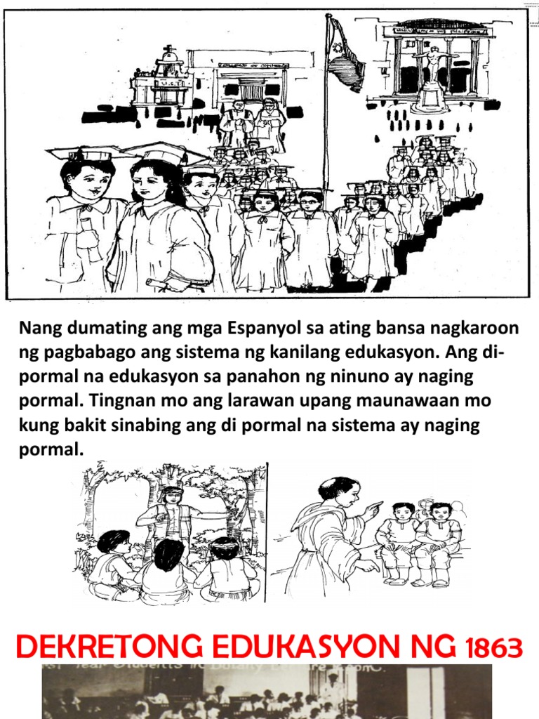 35 Isa sa mga layunin ng edukasyong inihahain ng mga Espanyol ay ang pagtuturo ng relihiyon para sa Christianization. Pagsisimula ng mga Ekspedisyon mula sa Espaa Pagkatapos mapag-aralan at gawin ang nilalaman ng modyul inaasahang magagawa mo ang mga sumusunod. Isabel - 1632 Colegio de Santa Rosa - 1750 Kumbento ng Asuncion - 1892 at Colegio ng Concordia - 1896.