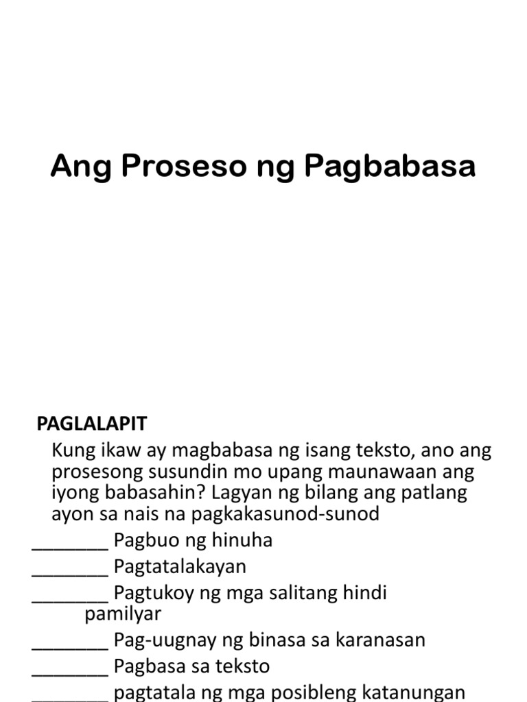 Pagbasa sa pamagat ng teksto Pag-scan o mabilisang pagbasa sa teksto Pagtatag ng layunin ng pagbasa sa teksto Pag-unawa sa impormasyon 2. B Iskimming- mabilisang pagbasa ng teksto c Detalyadong pagbasa- makuha ang wasto at kinakailangang mga impormasyon2. Save Save 10 PPT Pagbasa Pagbasa at Pagsusuri Ng Teksto For Later.