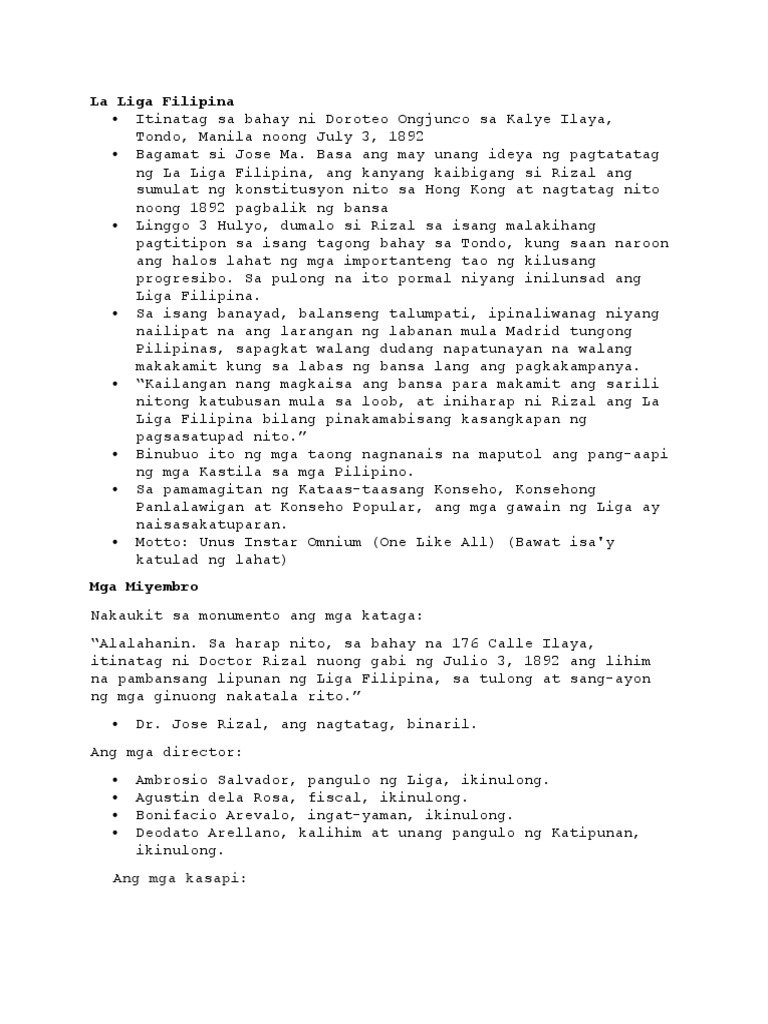 Binubuo ito ng mga taong nagnanais na maputol ang pang-aapi ng mga Kastila sa mga. Jose Rizal sa bahay niya sa Doroteo Ongjunco Tondo Manila noong 1892 Mga layunin ng La Liga Filipina. Ngunit ito ay nagtagal lamang ng tatlong araw.