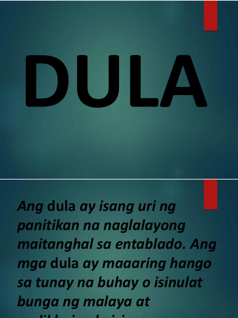 Dula Ang dula ay isang uri ng panitikang ang pinakalayunin ay itanghal sa tanghalan. Ang mga dula ay maaaring hango sa tunay na buhay o isinulat bunga ng malaya at malikhaing kaisipan ng manunulat o script writer. KahuluganKatuturan ng Dula 22.