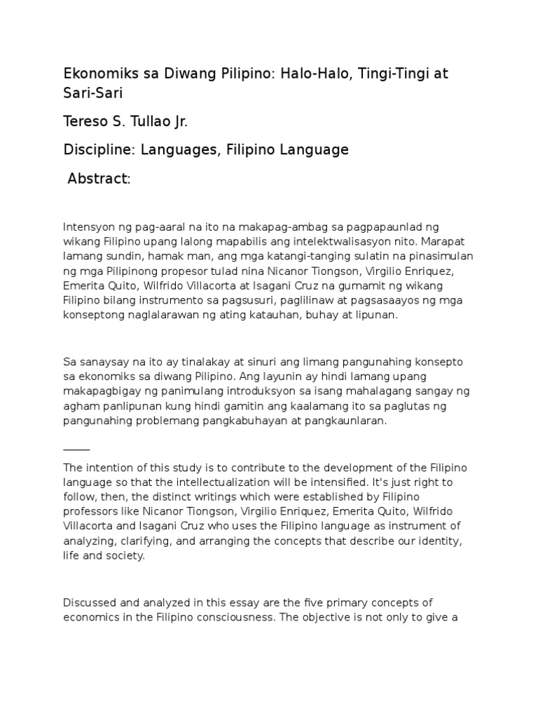 Pap 1 Docx Ekonomiks Sa Diwang Pilipino Halo Halo Tingi Tingi At Sari Sari Tereseo S Tullao Jr Introduksyon Si Don Santiago Syjuco Gawad Propesor Sa Course Hero
