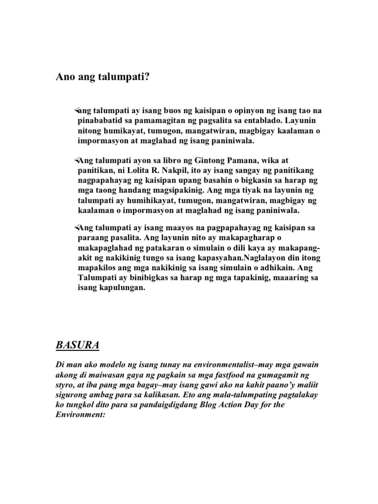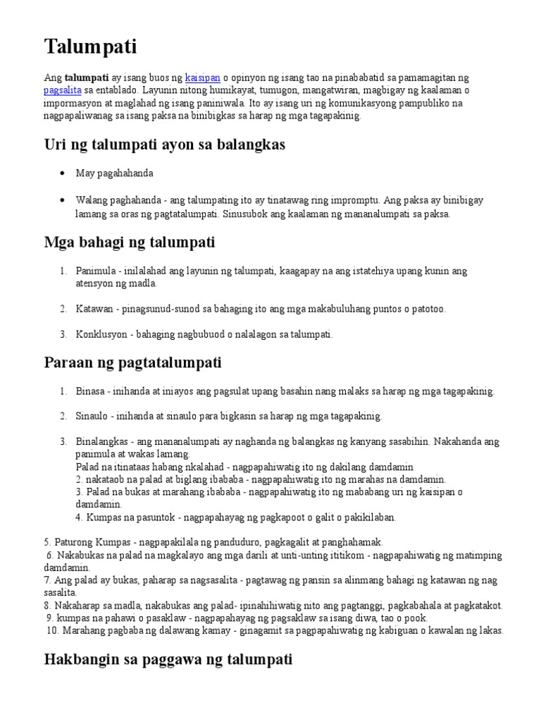 Una sa lahat atin munang balikan kung ano nga ba ang kahulugan ng isang talumpati. Ang talumpati ay isang buod o kaisipan o opinyon ng isang tao na ibinabahagi sa pamamagitan ng pagsasalita sa isang entbalado. If you continue browsing the site you agree to the use of cookies on this website.