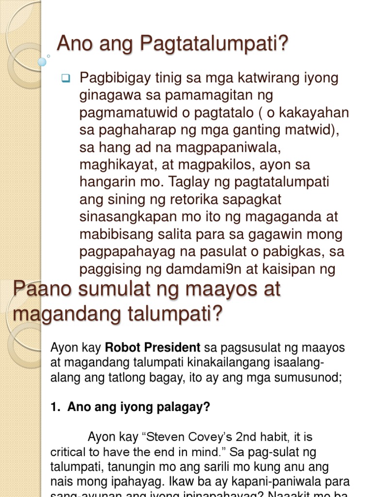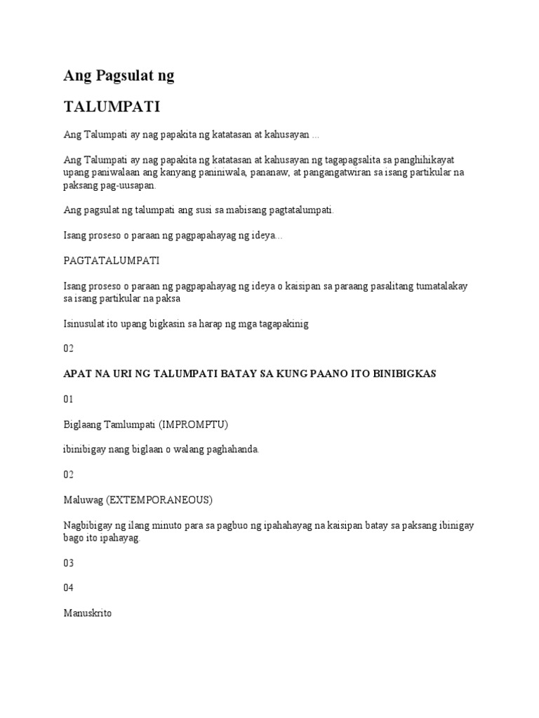 It is spoken in front of listeners. View ANG PAGSULAT ng TALUMPATIppt from BUSINESS 001 at University of South Asia Lahore - Campus 2. Ang Talumpati ay nag papakita ng katatasan at kahusayan ng tagapagsalita sa panghihikayat upang paniwalaan ang kanyang paniniwala pananaw at pangangatwiran sa isang partikular na.