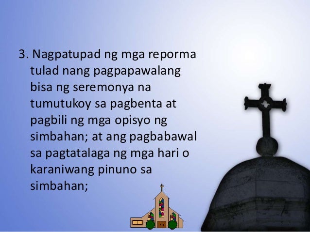 Ito y naglunsad ng repormasyong protestante noong ika-16 daantaon na nagsanhi ng pagkalas ng mga pangkat na protestante mula sa simbahang katoliko. Ang pananampalatayang Katoliko. Katesismo para sa mga Pilipinong Katoliko both in complete and abridged versions LINGKOD SIMBAHAN-Rario.