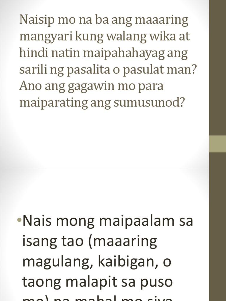 Ang wika ang ipunan- kuhanan ng isang kultura. Ang wika ay isang bahagi ng pakikipagtalastasan na ginagamit araw-araw. Learn vocabulary terms and more with flashcards games and other study tools.