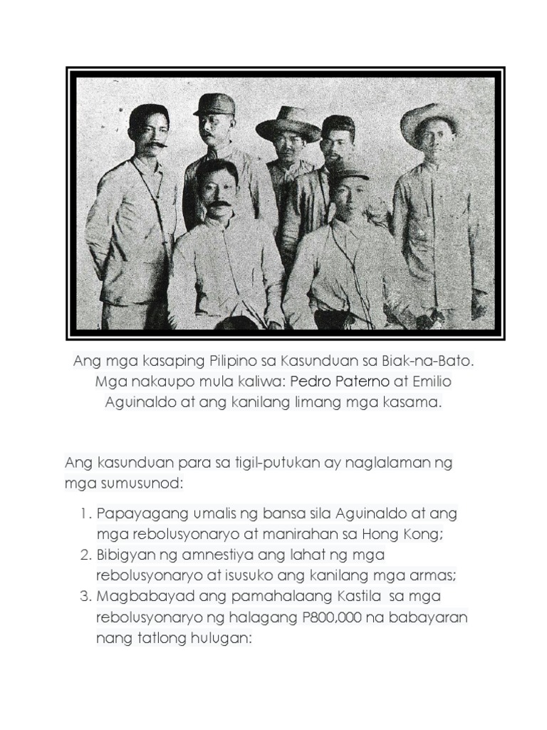 Aguinaldo and his fellow revolutionaries were given amnesty and monetary indemnity by the Spanish Government in return for which the revolutionary. Sa pamamagitan ni Pedro Paterno nilagdaan ni Gobernador-Heneral Primo de Rivera ang Kasunduan sa Barangay Biak-na-Bato. Mapanlinlang ang mga kastila.
