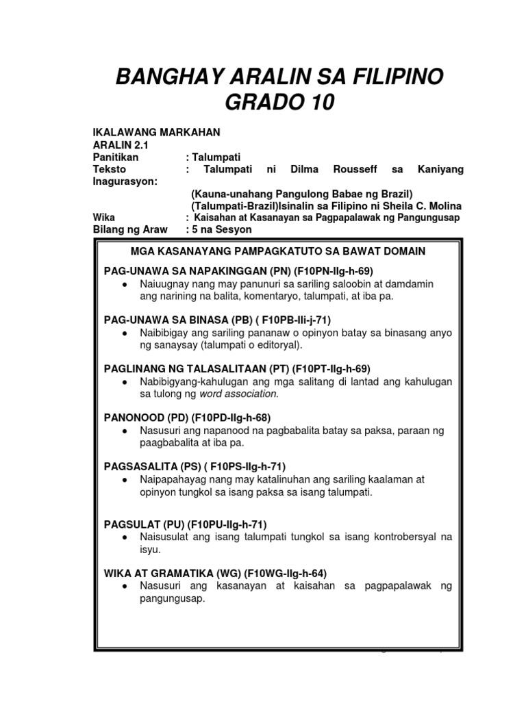 At wala na muling paghuhugutan ng dahilan ang mga Pilipino para lumaban at magkaisa para sa iisang layunin ano pa ang magbubuklod sa ating bansa. MGA LAYUNIN SA PAGTUTURO NG PAGSASALITA Nakatala sa ELC at PSSLC ang mga layunin sa pagtuturo ng pagsasalita sa paaralang elementarya at sekundarya. Ano ang pinaiigting ng dating Pangulong Benigno Aquino sa kanyang pagsasalita sa palatuntunanA.