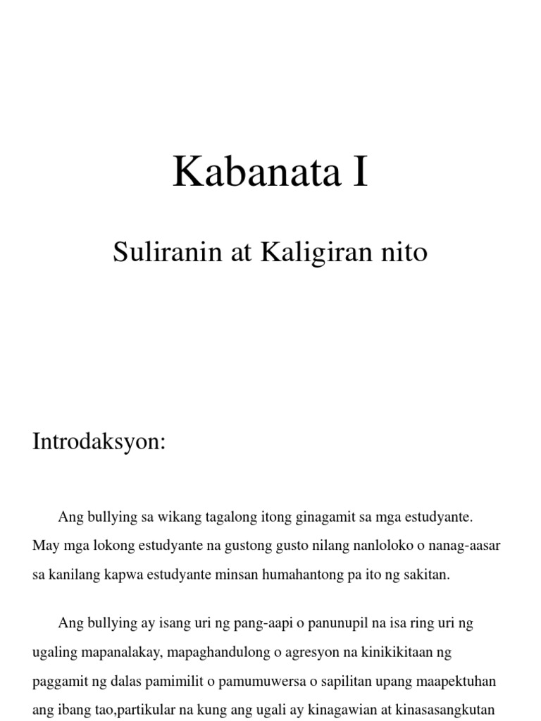 Ang kabataan ay namulat sa tinatawag na bullying Ang Pambubullly o bullying. At bago siya tuluyang nawalan ng ulirat ay wala siyang narinig kundi ang papanaog na yabag ng kanyang asawat anak at ang papaliit at lumalabong salitang. Saglit siyang natigilan sa pagpanhik sa hagdanan.