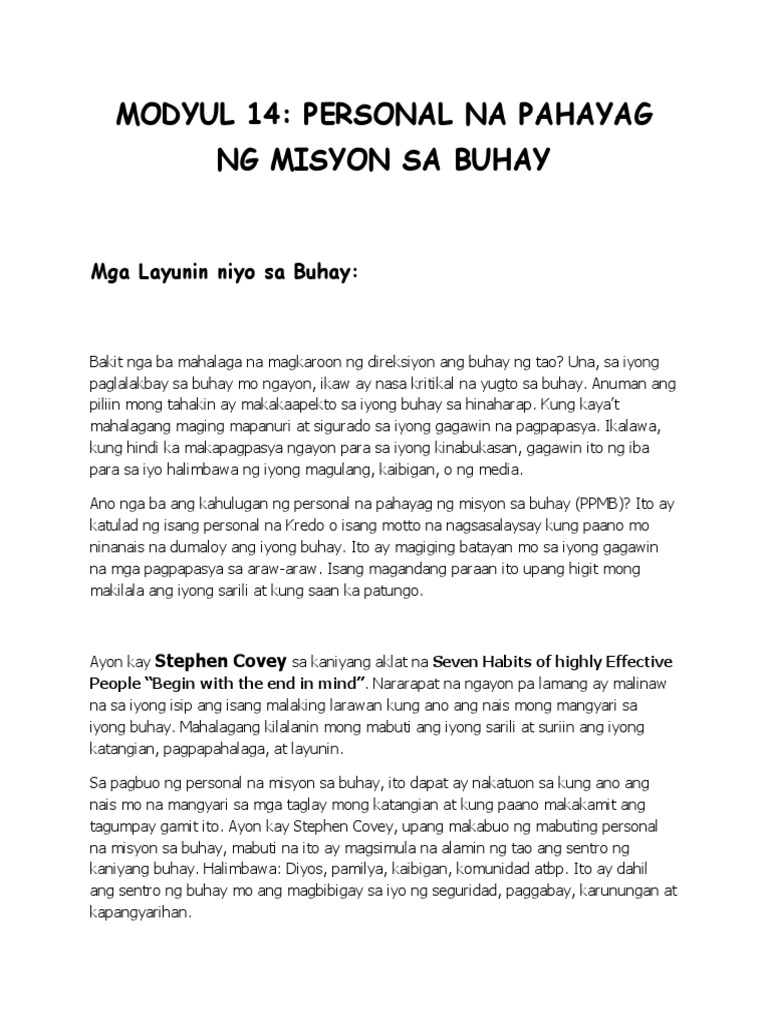 Modyul 14 Personal Na Pahayag Ng Misyon Sa Buhay