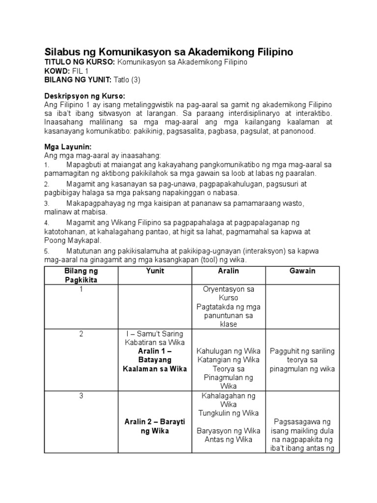 Silabus Ng Komunikasyon Sa Akademikong Filipino