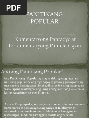 1Nasusulat ang mga nararapat na pamantayan sa matalinong panonood ng programang pantelebisyon. Hindi maikakaila napakalaki ng impluwensiyang nagagawa nito sa sambahayan lalo na nga at may katangian itong biswal o potograpiko. Opinyon at talakayang panradyo Dokumentaryong pantelebisyon Pelikula WIKA Mga salitang gamit sa komunikasyong impormal Mga hudyat ng konsepto ng pananaw Mga hudyat ng kaugnayang lohikal Tamang gamit ng mga komunikatibong pahayag Ang mga mag-aaral ay Nakapagpapamalas ng pag-unawa sa kaugnayan ng panitikang popular sa kulturang Pilipino.