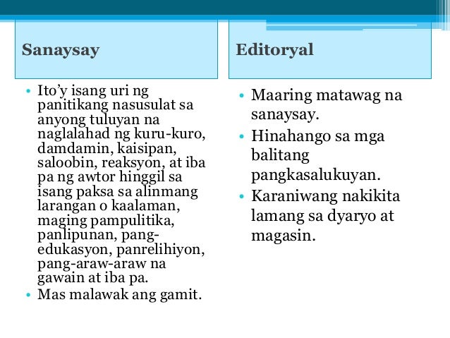 10092014 Itoy nagbibigay kaalaman o linaw sa ilang pangyayaring hindi gaanong maunawaan. Ito ay maikli ngunit makikita mo dito kung ano ang pinupunto ng naturang paksa. Kahulugan Ang editoryal ay hindi lamang kinakasangkapan upang hatakin ang mambabasa na pumaling sa isang panig ng pananaw o paniniwala bagkus upang kumbinsihinkung hindi man tahasang pilitinang sinumang awtoridad o pinatutungkulan na pumanig at gawin kung kinakailangan ang mungkahi ng.