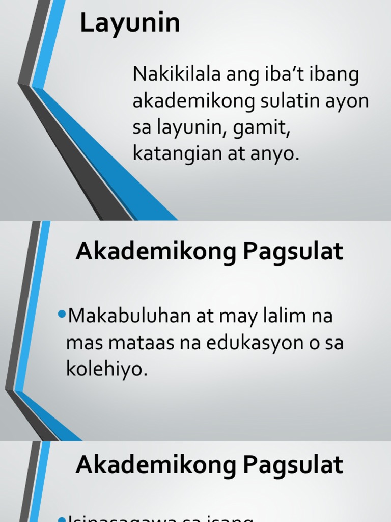 Samantala sa pag-oorganisa ng mga akademikong papel nalilinang ang kakayahang diskorsal ng mga mag-aaral. Sa pamamagitan kasi ng ng aplikasyon ng kaalaman sa gramatika at sintaktika sa mga gawaing pasulat naililinang ang kakayanhang pagmatik ng mga mag-aaral. Start studying Q1M4 - Layunin at Gamit ng Akademikong Pagsulat.