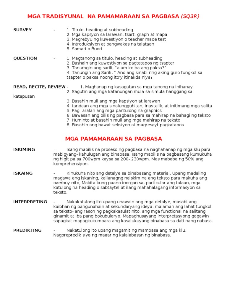 Mga Tradisyunal Na Pamamaraan Sa Pagbasa Sq3r