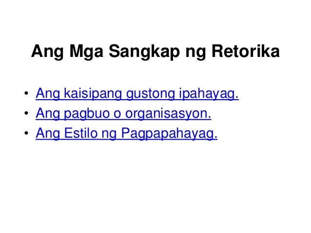 Sangkap ng retorika. Matatandan na malaking papel ang ginagampanan ng retorika bilang isang mahalagang sangkap ng pagpapahayag maging sa pormal na pananalumpati. KALIKASAN AT MGA SIMULAIN NG RETORIKA KAHULUGAN NG RETORIKA. Pag-aaral ng anyo uri ng mga salita.