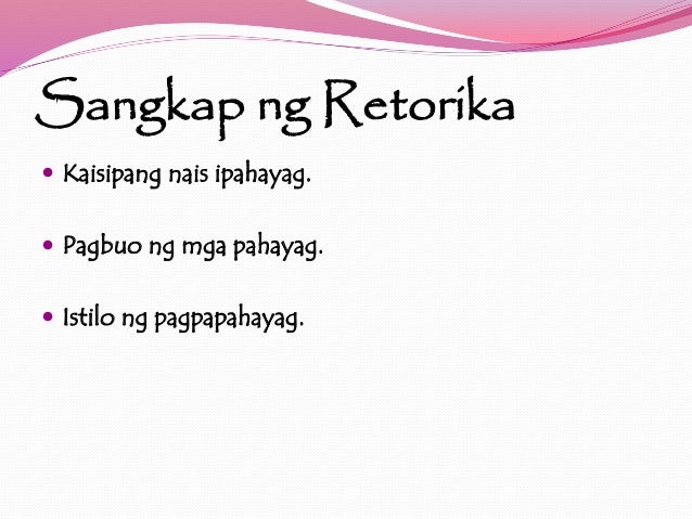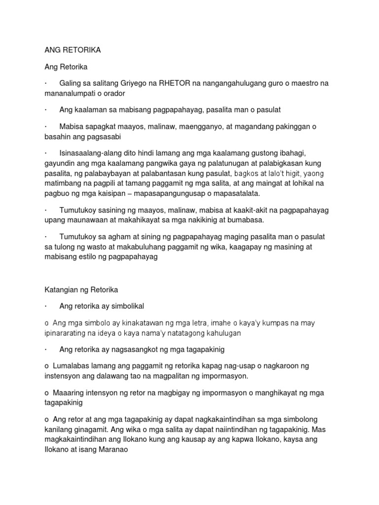 Ang retorika ay Sining o agham ng paggamit ng salita sa mabisang paraan pasalita man o pasulat. 08072014 Ang retorika ay sining ng mabisa at magandang pagpapahayag na sumasaklay sa maraming sangkap na may kaugnayan sa pagsusulat gaya ng pananalita himig struktura at kalinawan sa pagpapahayag sulat memo ulat pagsusuri pamanahong papel paghahanda sa mga proposal ng mga proyekto o anu mang klase na may kaugnayan sa pagsusulat o paglalarawan.
